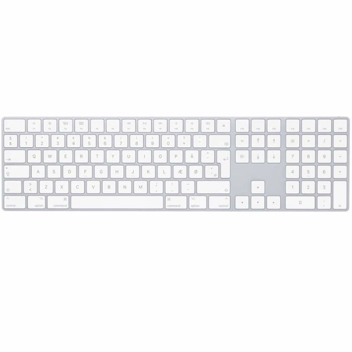 Deze Apple Magic Keyboard with Numeric Keypad QWERTY Danish aluminium werkt draadloos op je Mac of computer. Sluit het toetsenbord aan via Bluetooth en er liggen geen kabels op uw bureau. Met het extra numerieke toetsenblok kun je snel cijfers invoeren en is er extra ruimte voor de pijltjestoetsen.