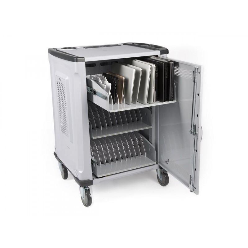 Met de Griffin Universal Charge Cart kun je gemakkelijk tot 32 apparaten tegelijk opladen. Je kunt met jouw eigen kabel jouw apparaat opladen in de Griffin Charge Cart. De cart heeft één stopcontact nodig om al jou apparaten op te laden, zo kom je niet in ruimtegebrek. De nieuwe Griffin Universal Charge Cart is de meest compacte en flexibele manier om meerdere apparaten tegelijkertijd op te laden, op te bergen en te synchroniseren. Dat maakt de Griffin Charge Cart het ideale docking station voor bijvoorbeeld bedrijven, zorginstellingen en scholen.