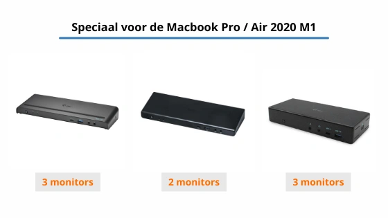 Niet elk docking station ondersteunt meerdere beeldschermen / monitors voor de Macbook Pro / Air met M1 / M2 chip. We hebben speciale docking stations in ons assortiment welke met een ingebouwde videokaart komen. Door de ondersteuning van deze videokaart kunnen er alsnog meer dan één beeldschermen worden aangelsoten op de Macbook Pro M1 / M2 en Macbook Air M1 / M2. Uiteraard zijn alle docking stations te gebruiken met de Macbook Pro / Air M1 / M2 en andere modellen. Het gaat hierbij puur om de ondersteuning van twee of meer beeldschermen. Bekijk onze docking stations voor de Macbook Pro / Air M1 / M2 of klik op onderstaande afbeelding.