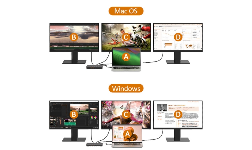 - DisplayLink multi-monitor ondersteuning: sluit tot drie externe schermen aan, waaronder 8K HDMI (DP Alt Mode) en dubbele 4K-uitgangen via DisplayLink – zelfs op MacBook M1- en M2-modellen