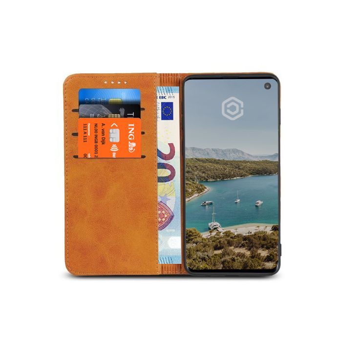 De Casecentive Leren Wallet Case Samsung Galaxy S10 tan geeft je de mogelijkheid om je smartphone en pasjes op een veilige manier op te bergen.
