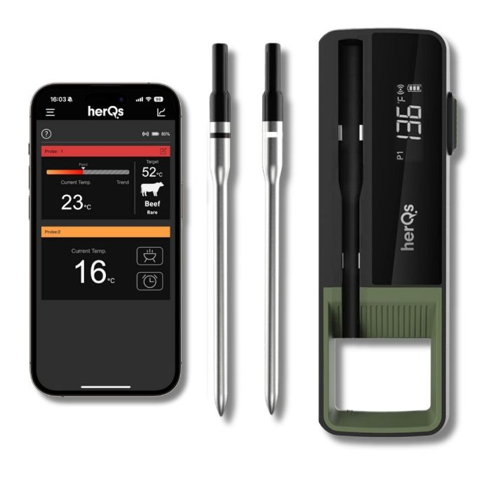 De HerQs Double Max, een ultradunne draadloze vleesthermometer, biedt een revolutionaire ervaring voor zowel hobbykoks als professionals. De vleesthermometer met dubbele probe maakt het mogelijk twee stukken vlees tegerlijkertijd te meten met een indrukwekkend temperatuurbereik tot 500 graden Celsius. Deze geavanceerde thermometer belichaamt efficiëntie, precisie en betrouwbaarheid. Niet alleen excelleert de HerQs Double Max in temperatuurmeting, maar met een duurzaamheidsfactor die tot 72 uur meegaat, is hij ook perfect geschikt voor langdurige kooksessies.