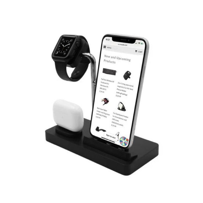 De Macally 3 In 1 Apple stand is een standaard voor al je Apple producten. De rubberen antislipgrepen en verzwaarde metalen basis houden je Apple producten veilig zonder ze plat op kwetsbare plekken te leggen. Installeer de oplaadkabels gemakkelijk aan de stand om hem tegelijk op te laden.