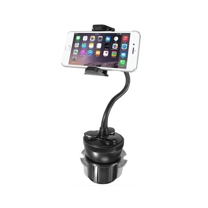 De voet van de bekerhouder is verdraaibaar zodat deze in verschillende bekerhouders past en makkelijk vast te zetten is. Daarnaast is de houder van de smartphone ook verstelbaar, zodat ook daar verschillende maten smartphones inpassen en deze vast gezet kunnen worden (max breedte houder 10.5 cm).