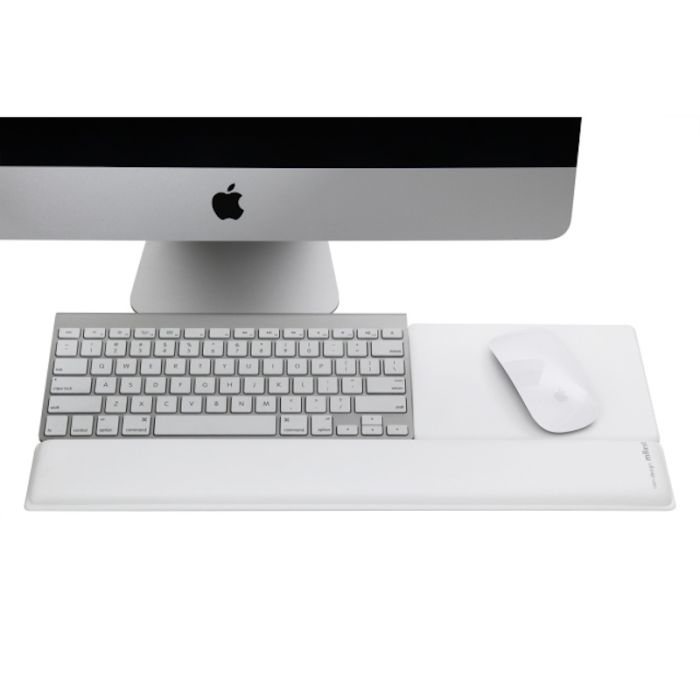 Deze polssteun is geschikt voor gebruik met het compacte draadloze Apple toetsenbord en biedt voldoende ruimte voor een muis. Deze veelzijdigheid maakt het een praktische keuze voor elke werkplekconfiguratie, zodat je overal waar je werkt een ergonomische opstelling kunt handhaven.