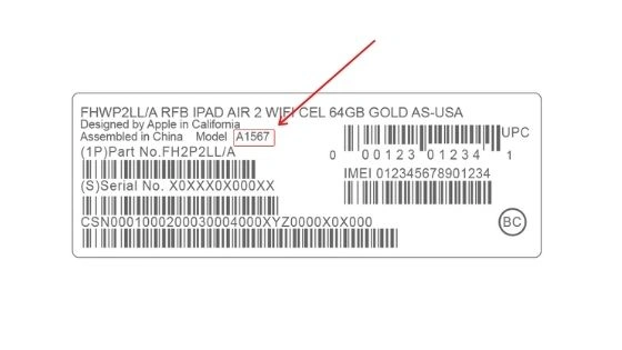 Op de onderkant van de verpakking van de iPad vind je een sticker met diverse gegevens, waaronder het modelnummer. Dit begint altijd met de letter 'A', gevolgd door een viercijferige cijfercombinatie.